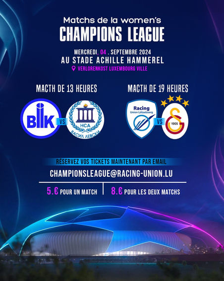 Nous avons le plaisir de vous annoncer que le 1er tour de la Women’s Champions League se déroulera à Luxembourg ! Le Racing Union affrontera le Galatasaray au stade Achille Hammerel. Nous comptons sur votre présence en nombre pour soutenir notre équipe.